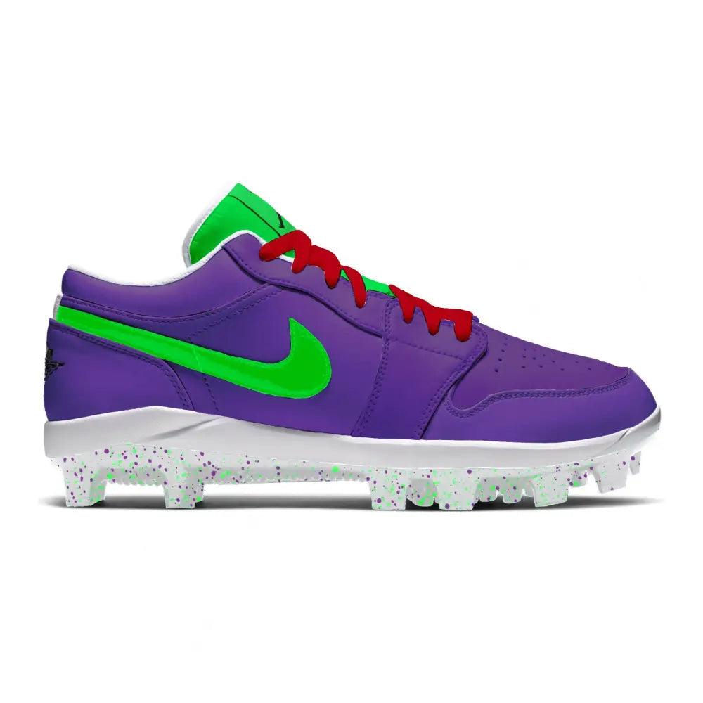 Purple, green, and red Cheetah Jordan 1 Retro Cleats baseball cleats front view