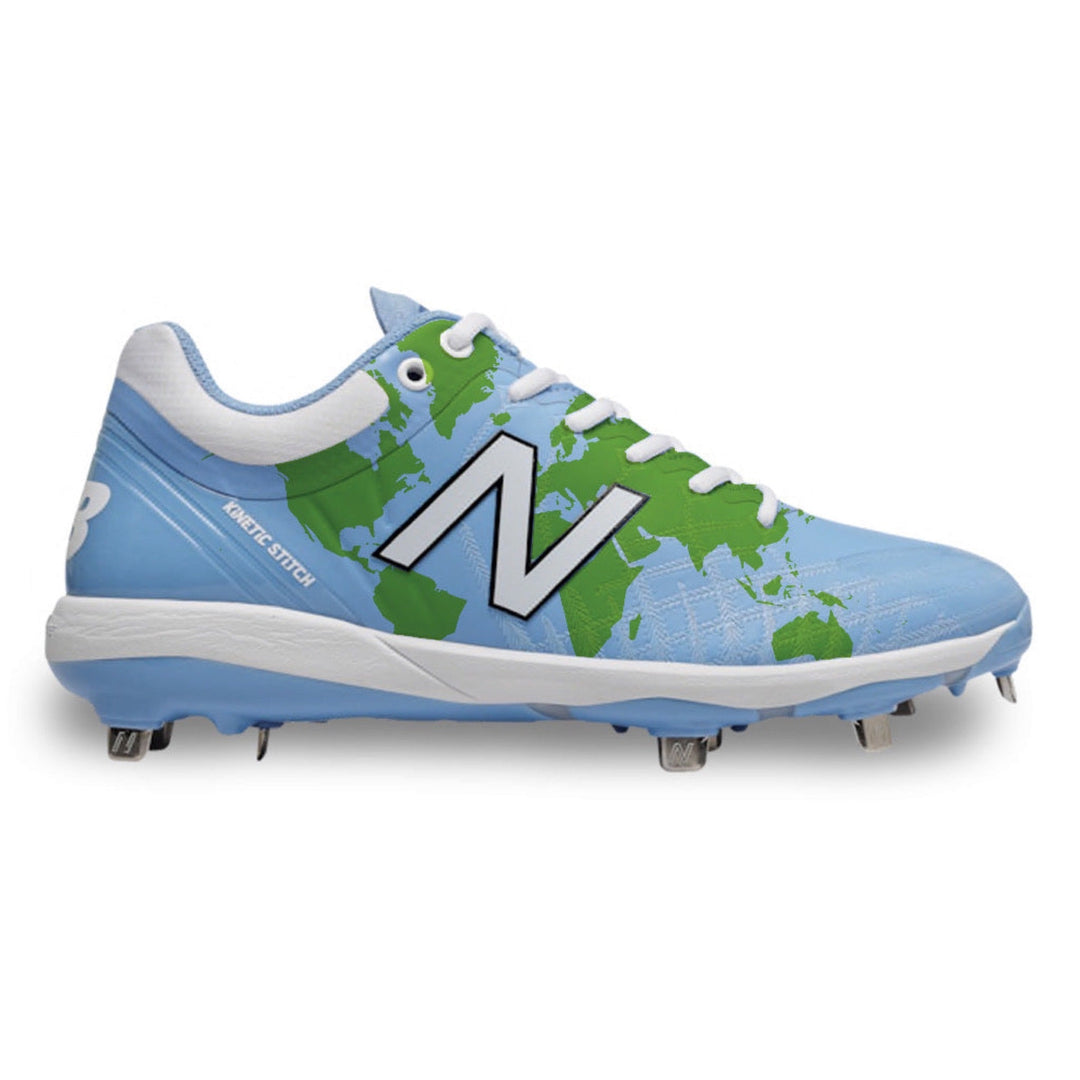 Light blue Globe New Balance 4040v5 baseball cleat with world map design