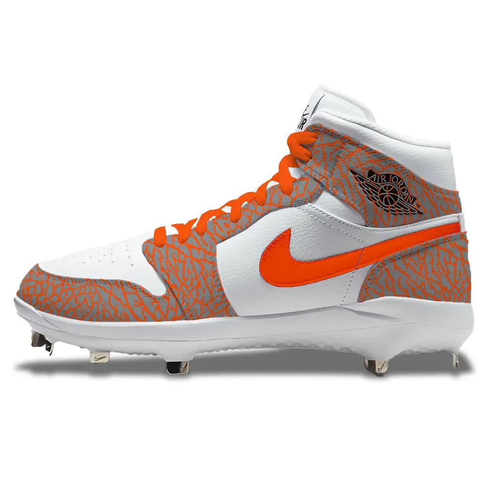 White and orange baseball cleat from Orange Elephant Jordan 1 Retro Cleats collection