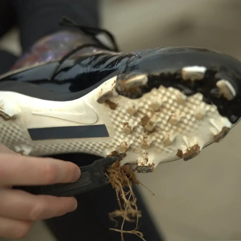Muddy black and white cleat cleaned with CleatClear™ cleaning tool