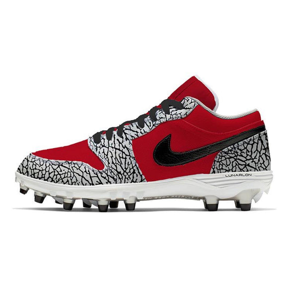 Red and gray Nike baseball cleat from Red Cement Jordan 1 TD Cleats collection