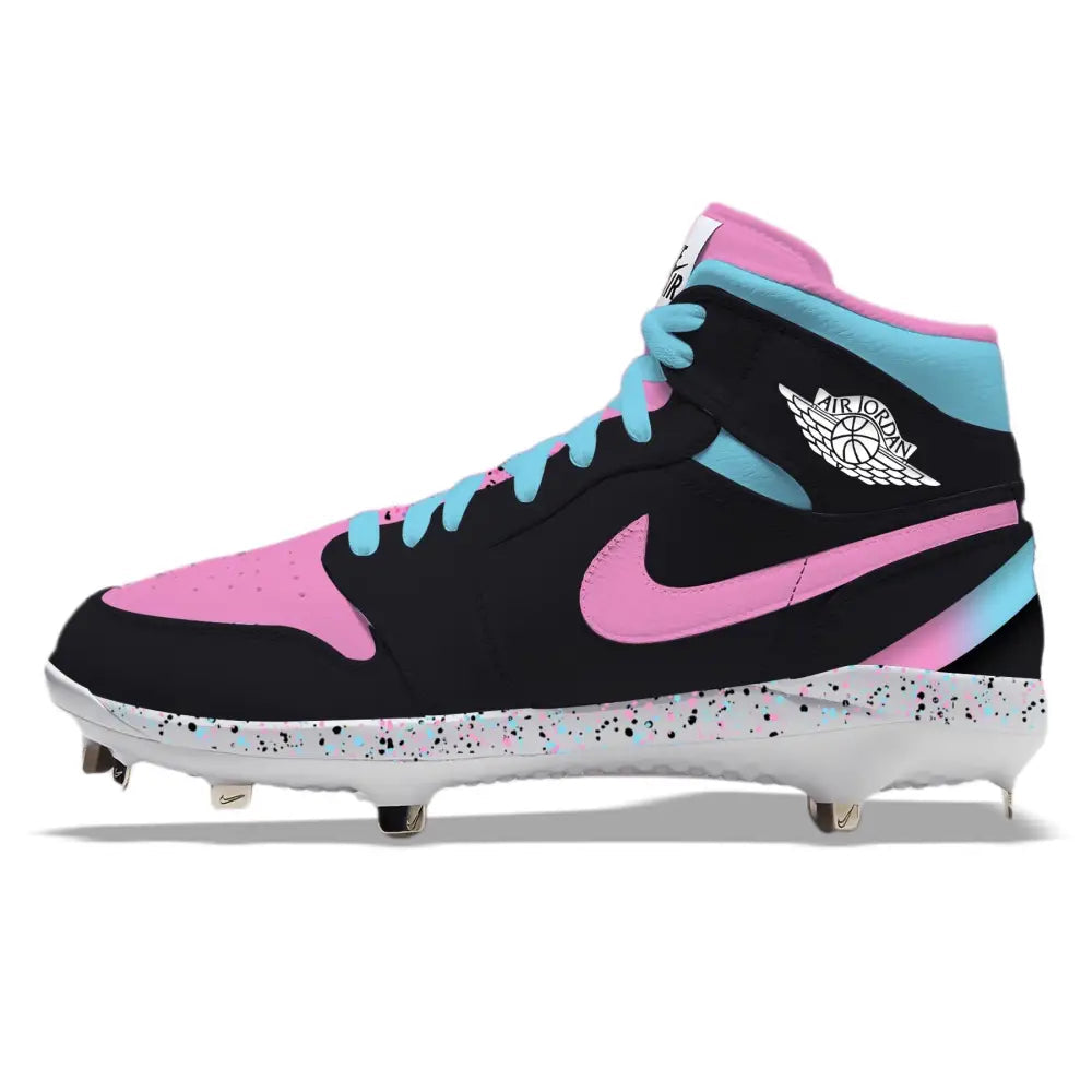 Pink and blue Air Jordan baseball cleat on display in Double Trouble Jordan 1 Retro Cleats